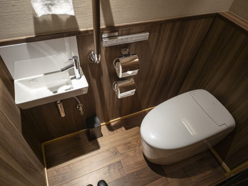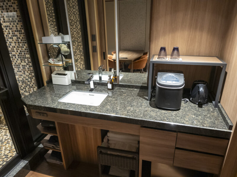 ダイニングの隣には洗面所です。バスタオル類は豊富にあるので、たくさん露天風呂に入れます。