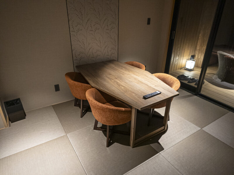 ベッドルームの隣にはダイニングがあります。畳ですけど和洋室なのでテーブル席になってます。タイニングにもテレビがありますので、部屋にはテレビが計2台あります。