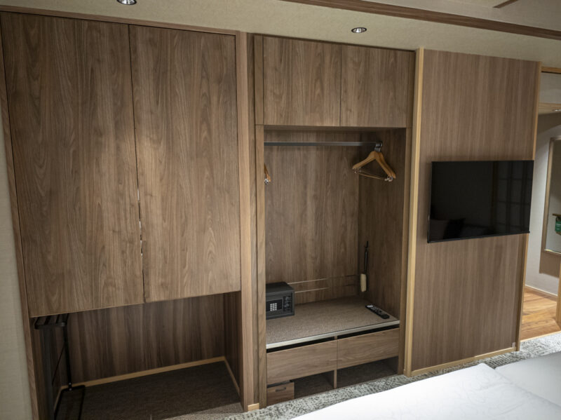 ベッドルームの反対側です。オープンクローゼットとテレビがあります。収納の中には予備の枕や布団があります。