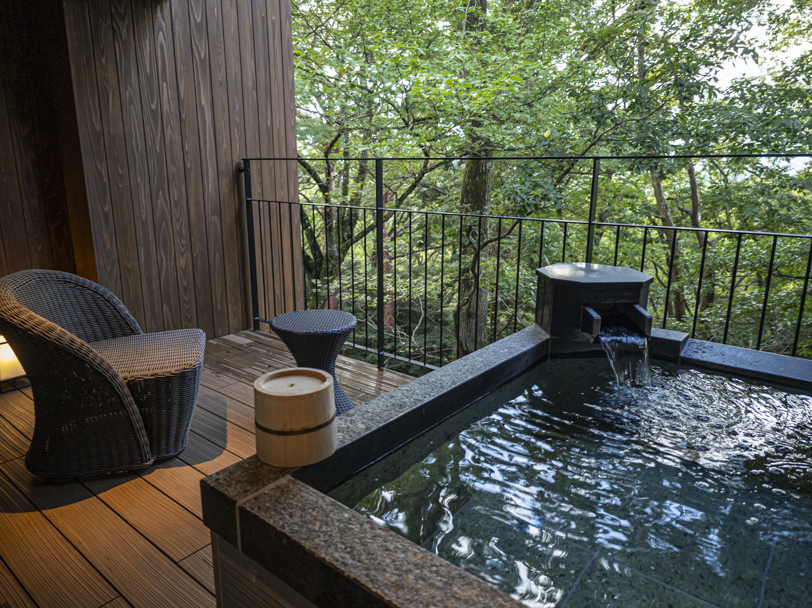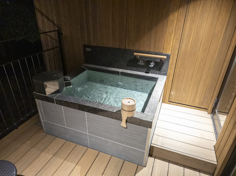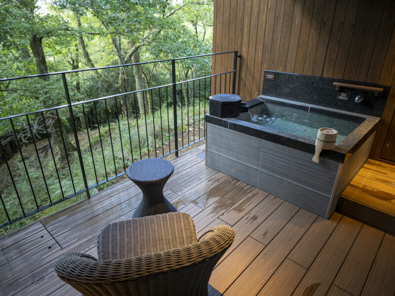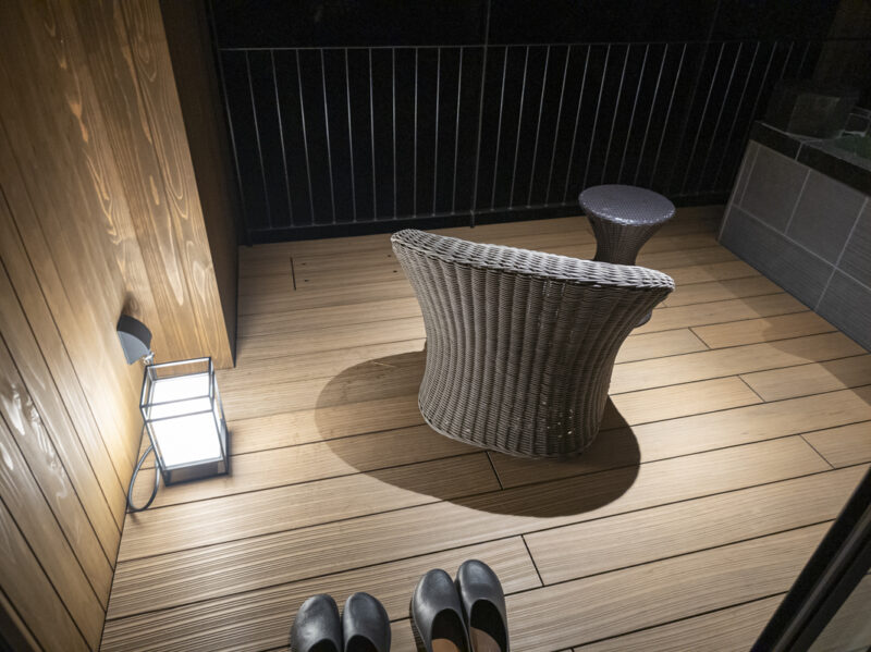 露天風呂は滞在中に何度も堪能しました。少し風が強かったのが風呂上がりに厳しかったですが、テラスで快適に過ごすことができました。ラタンチェアでぬくぬくしてました。