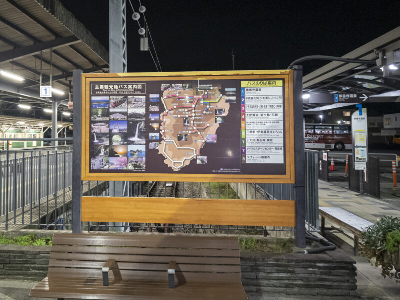 最寄りの修善寺駅には夜に到着しました。右の奥に見える最終便のシャトルバスでラフォーレ修善寺に向かいます。