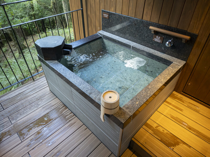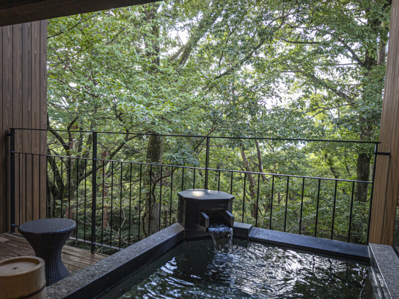 温泉露天風呂です。広いテラスがあります。伊豆マリオットホテル修善寺や琵琶湖マリオットホテルと同じ仕様の温泉風呂ですが、広々としたテラスを満喫できるのは山紫水明ならではです。