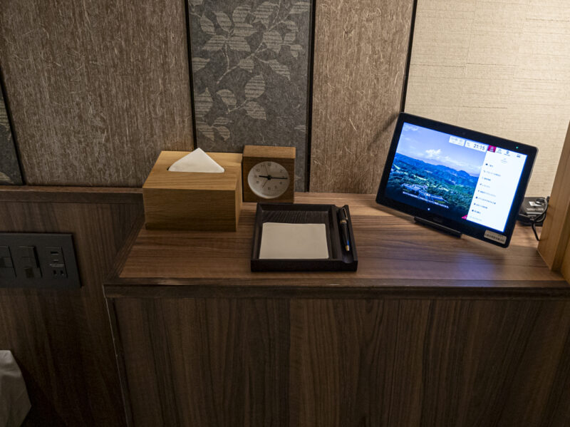 ベッドのサイドにはタブレットが置かれています。このタブレットを使用してフロントに連絡可能で、便利でした。ワンクリックでフロントと電話がつながり、敷地内の移動用バスをすぐ手配してくれます。