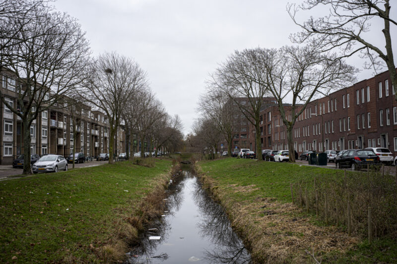 中心地からトラムで移動して、少し離れた地域に行きます。このようなオランダらしい風景の場所にお目当てのミューラルがあります。