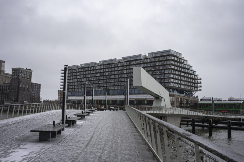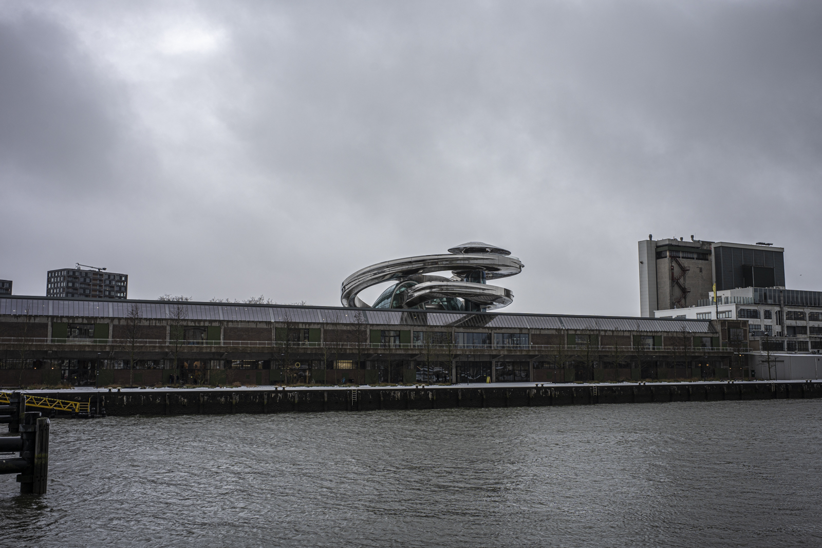 Fenix Iです。100年前の倉庫の屋根の上に、巨大な新しいマンションを乗っけた建物です。遠目にはクルーズ船みたいなデザインです。