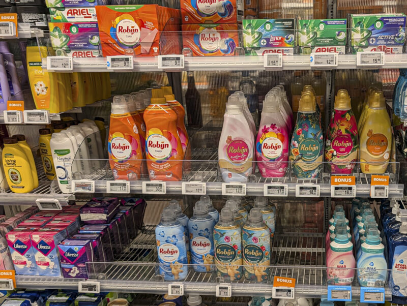 滞在が延びたため、持参したトラベル洗剤がなくなってしまい、現地でRobijnというメーカーの家庭用洗剤を購入しました。オランダの洗剤は白用、黒用、カラー用とありますが、カラー用を選びました。ボトル式でちょっとサイズが大きかったですが、仕方ありません。