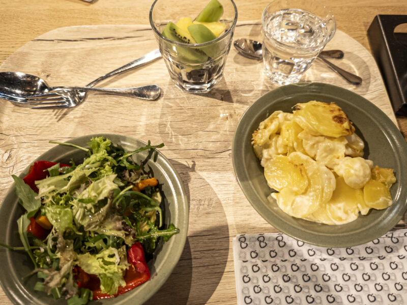 サラダとかフルーツとか旅先で不足しがちな栄養を主体に。レストランでピンポイントで適量を注文するのは難しいので、重宝しますす。